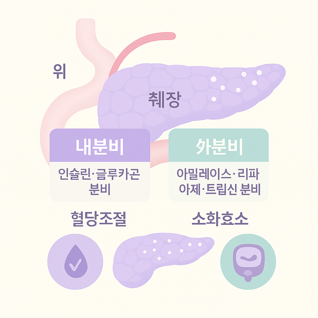 내분비는 호르몬처럼 몸속 혈관을 통해 작용하는 시스템이고, 외분비는 소화효소처럼 외부 기관(장기나 피부 표면 등)으로 작용하는 방식이에요. 췌장은 이 두 가지를 모두 수행하는 독특한 기관이에요. 그래서 '내분비 기관'이자 '외분비 기관'이라는 이중 타이틀을 갖고 있답니다.